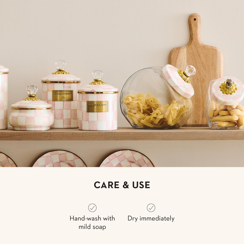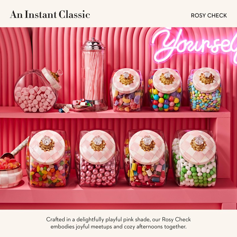 - CUTE PINK CHECKERED COOKIE CONTAINER: Our Cookie Jar with Rosy Check Enamel Lid is perfect for storing everything from cookies to jelly beans to cornflakes to sugar cubes. The gorgeous lid is hand painted with our pretty pink-and-white Rosy Check pattern, which adds signature style.