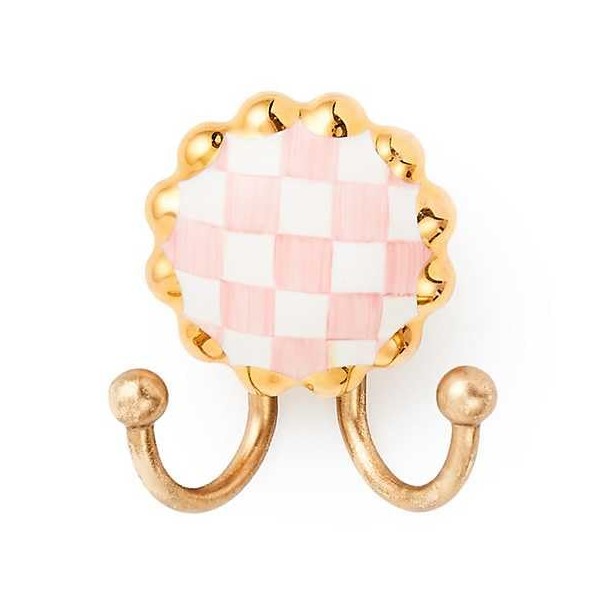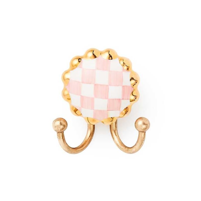 - ELEGANT HANGERS: Our Rosy Check Round Hook features 2 decorative hooks on a round scalloped mount made of hand-glazed ceramic and decorated with pink-and-white checks and gold luster.