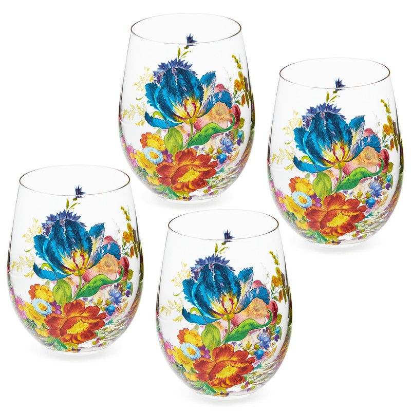 MACKENZIE-CHILDS Stemless Wine Glasses, Decorative Wine Glasses, 16 Ounces, Set of 4, Flower Market