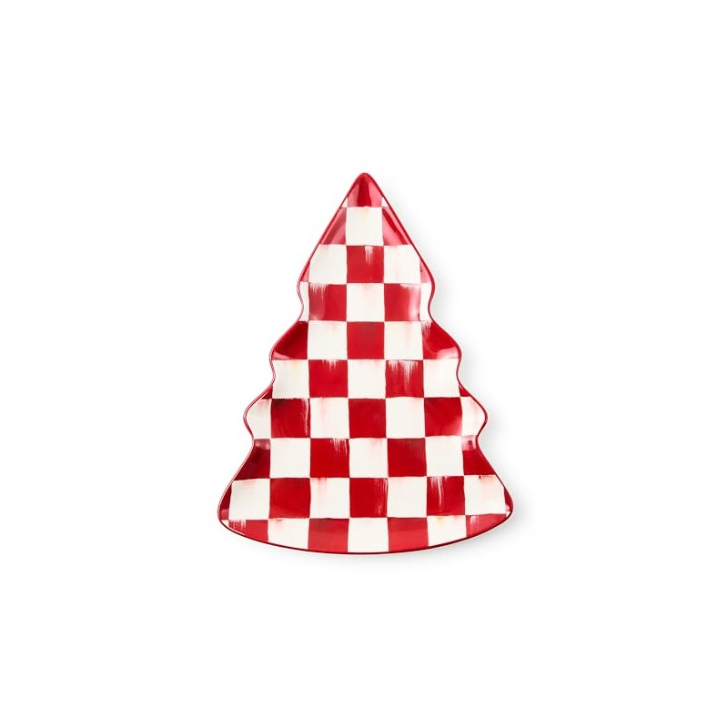 MACKENZIE-CHILDS Stoneware Tree Dish, Decorative Serving Tray for Christmas, Red-and-White Cherry Check