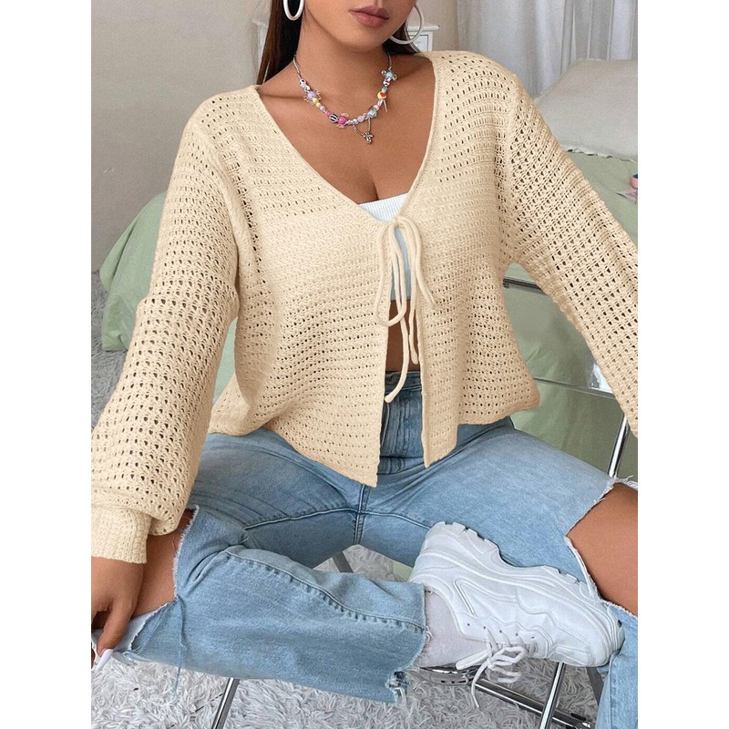 MACNOORA Women's Plus Size Tie Front Cardigan Hollow Out Open Knit Sweater Front Tie Shrug, Acrylic and Rayon Fabric, Apricot