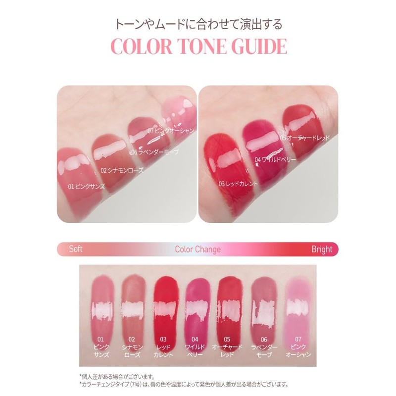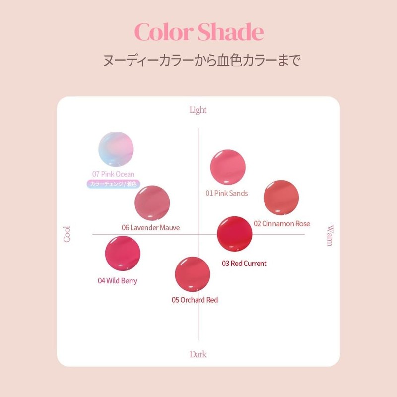 - とろけるようなメルティングテクスチャー: 唇に触れるととろけるように広がり、軽く塗るだけでぷるんと潤い、鮮やかな発色とツヤが長時間持続します。