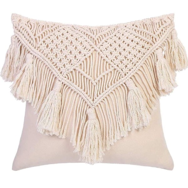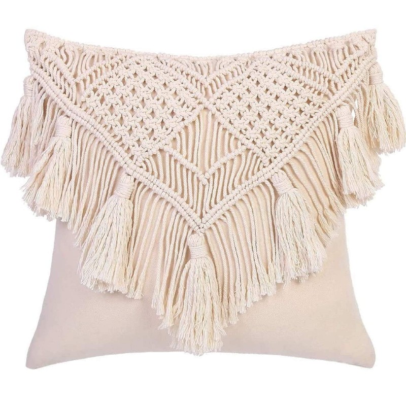 Macrame Cushion Case, Woven Boho for Sofa Couch Bench Car Home Decor, Square Pillow Cases with Tassels (1, 16 inches)