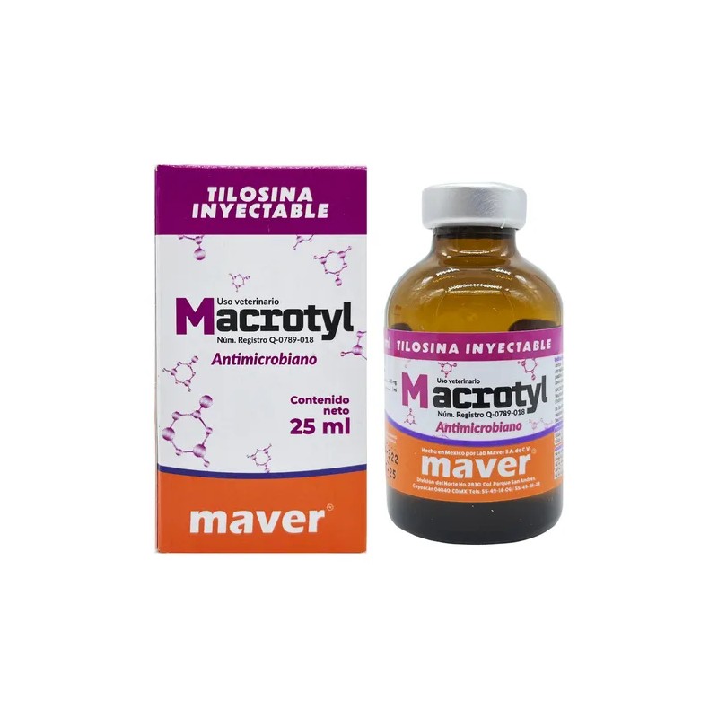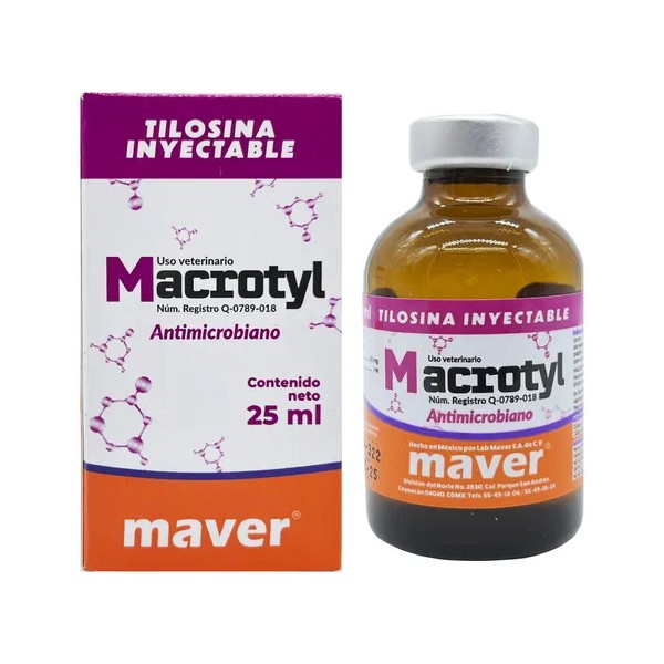 Macrotyl 25 mL de la marca Maver es un antibiótico inyectable formulado con tilosina, especialmente diseñado para el tratamiento y control de infecciones respiratorias e intestinales en aves como gallos y gallinas. Su acción combate eficazmente enfermedades como la micoplasmosis, el cólera aviar y la coriza. Es una solución confiable para mantener la salud de tus aves y prevenir brotes infecciosos en granjas o criaderos.