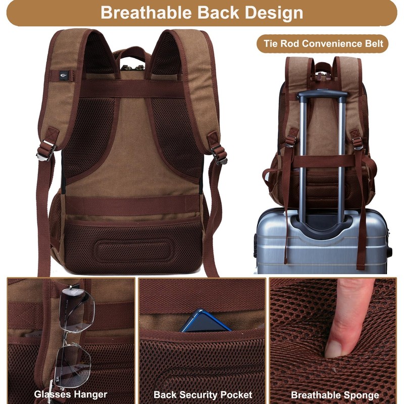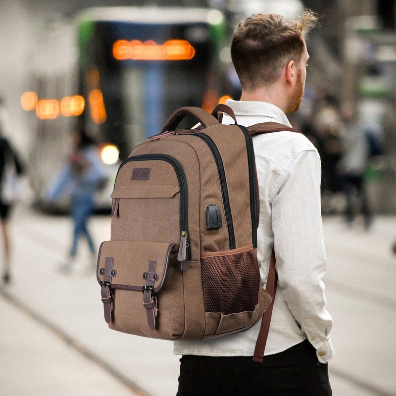 Mactso Canvas Travel Laptop Backpack for Men Women, Business Work Rucksack College Computer Bag Fits 17.3 Inch Notebook,Bookbag with USB Charging Port (Coffee, 17.3 Inch)