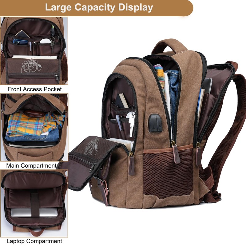 - 【Durable Material】: Made of high-density canvas and vegan leather trim;Polyester lining(Not Water Resistant). Backpack has various built-in compartments as well which makes it perfect for university, travel, business, daily use and outdoor activities.(THIS ITEM IS NOT INTENDED FOR USE BY PEOPLE 12 AND UNDER.)