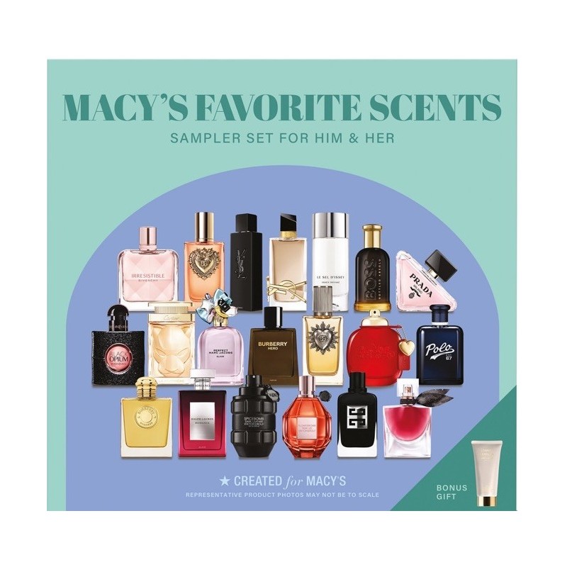 Indulge in the variety of scents with the 21-piece Macy's Favorites Scents Sampler, a curated selection of perfumes designed for both Him & Her. Each half-fl oz spray allows for a personalized fragrance experience, perfect for discovering new favorites or sharing with friends. The assorted scents within this set promise a delightful olfactory journey, ideal for those who love to explore different fragrance profiles.