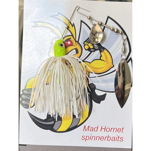 3/8 oz spinner bait with chartreuse head silver eyes, white skirt. Powder coated head, worth Colorado bottom blade in nickel, worth willow top blade in nickel. Eagle claw razor sharp hook, nickel beads, barrel swivel. 100% positive feedback so bid with confidence and good luck.#012