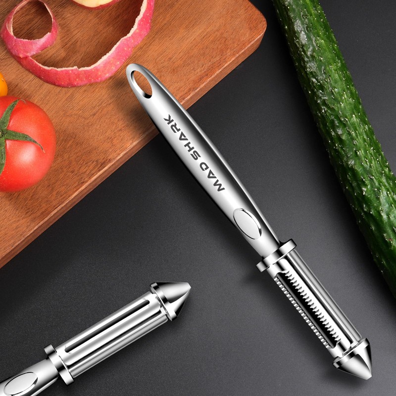 - MULTI-PURPOSE VEGETABLE FRUIT PEELER: ① The unique V-shaped spoon design easily removes uneven parts of vegetables and fruits②This vegetable peeler features smooth glide technology to ensure smooth, clog-free peeling③Ultra-sharp blades retain the nutrients of fruits and vegetables, perfect for peeling potatoes, cucumbers, carrots, apples, tomatoes and more