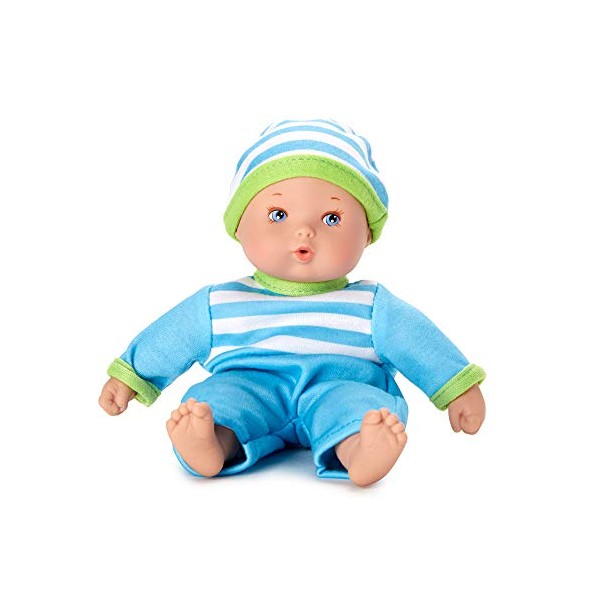 - Details: Dressed in colorful, removable outfits, their beautiful painted eyes and lively faces are sure to charm your child; Dressed in a blue striped sleeper and hat; Features light skin tone and blue eyes