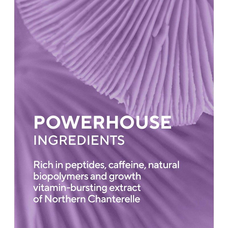 Die natürliche, zertifizierte Formel basiert auf einem Cocktail aus Peptiden, aus Pilzen gewonnenen Wachstumsvitaminen, Koffein und natürlichen Biopolymeren, um Brauen und Wimpern wieder mit Volumen, Länge und Glanz zu versorgen.