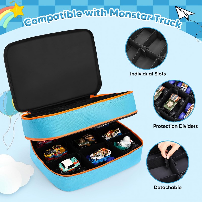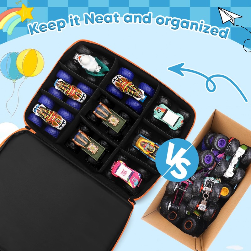 - The toy cars organizer for Monster Toy Trucks features with inside 8 detachable Hook & Loop slots. The case is suitable for small race toy cars and other small kids toy cars.