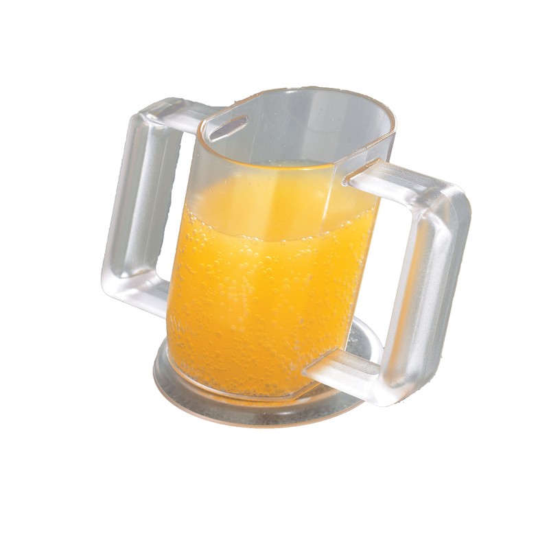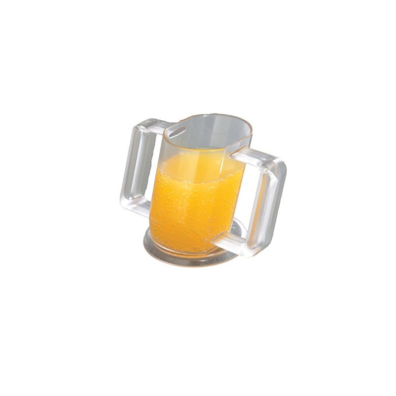 - Two-handled transparent cup with extra wide base provides a secure grip and stability while reducing the occurrence of accidental spills