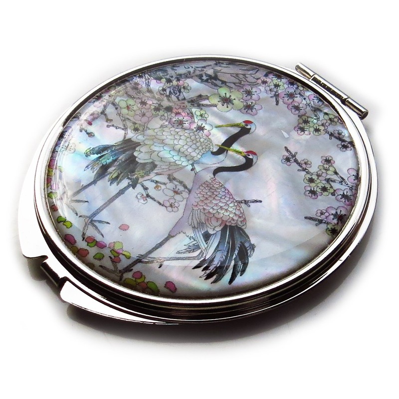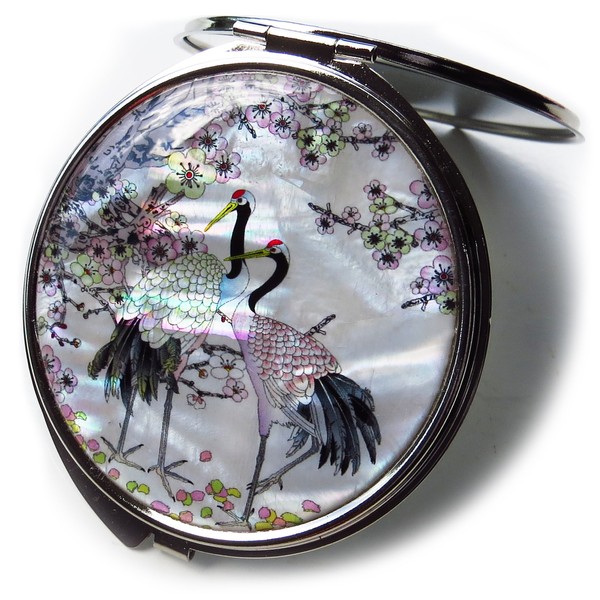 MADDesign Mother of Pearl Compact Mirror Round Double Sided Folding Magnify Crane Apricot Tree Design
