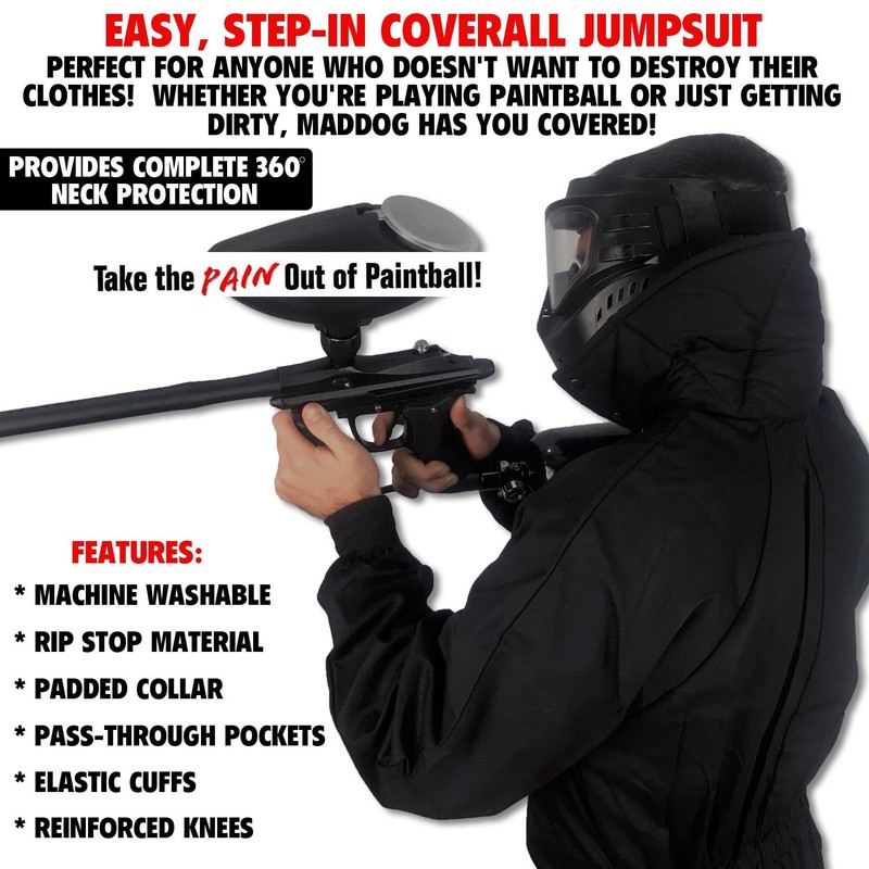 - PERFECT FOR ANYONE WHO DOESN'T WANT TO DESTROY THEIR CLOTHES! Easy, Step-In Coverall Jumpsuit Built for Paintball, Airsoft, Scenario, Dirty Work, Etc. Whether You're in the Heat of the Battle or Just Getting Dirty, Maddog Has You COVERED!