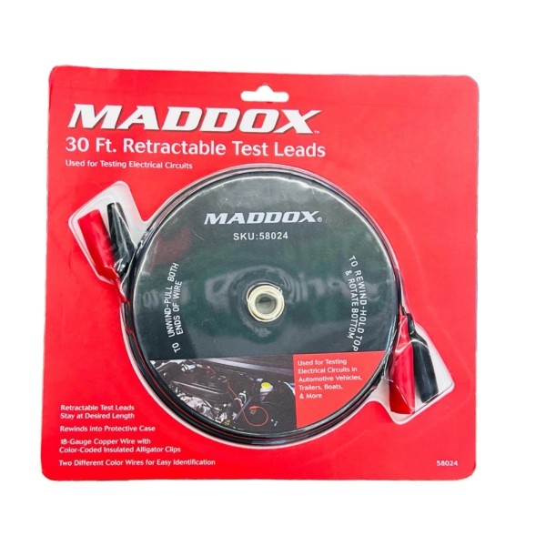 ▪️These MADDOX® 30 ft. retractable test lead offer a heavy duty design making it easier than ever to test circuits on automobiles, trucks, trailers, boats, and more. Eliminates the need for a second person when checking circuits. Handles current up to 6 amps wound and 10 amps unwound.
