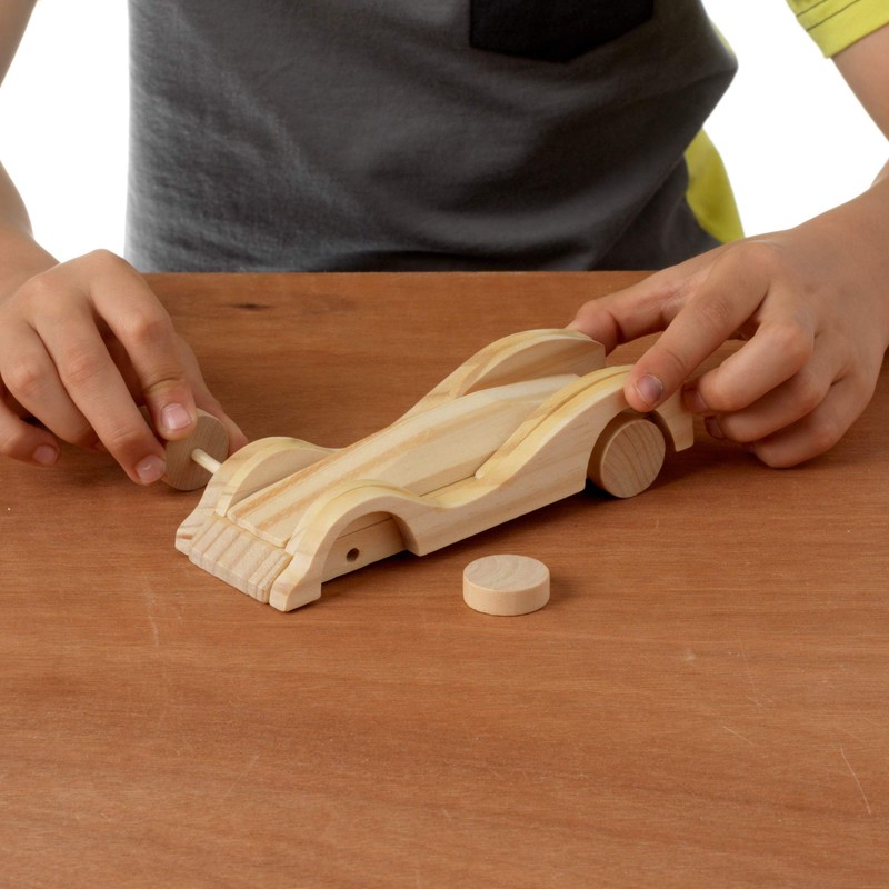 Includes everything you need to decorate Wooden Cars. 42 Pre-Cut and Pre- Sanded Wooden Pieces, Sand Paper, 3 Sticker Sheets, 12 Pots of Acrylic Paint (0.101 fl oz each), 3 Pots of Glue (.101 f oz each), 2 Paintbrushes, Easy-to- Follow Instruction Booklet.