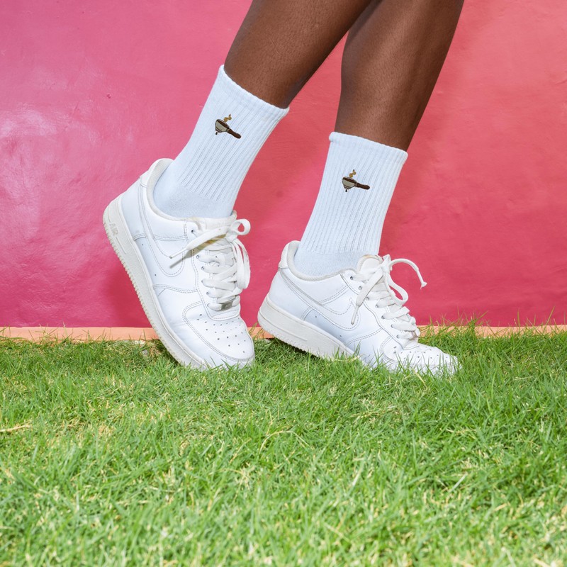 These white tennis socks with motif are a must-have for all coffee fans. The high-quality embroidery with coffee cup, portafilter and mocha pot make them real statement socks. Thanks to the soft cotton blend, they are super comfortable, breathable and elastic. Whether as funny socks for men, funny crew socks for women or as part of a cool festival outfits; these good mood socks are versatile.