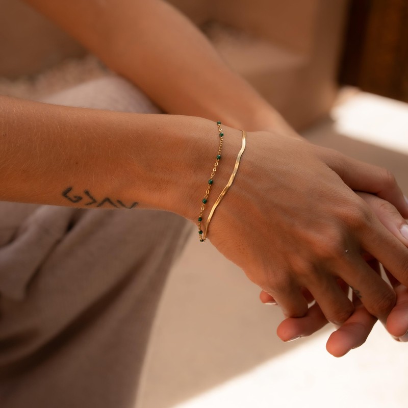 This unique set includes a simple gold bracelet and a women's pearl bracelet decorated with colourful beads. The combination offers stylish versatility and highlights the jewellery women's gold trend.