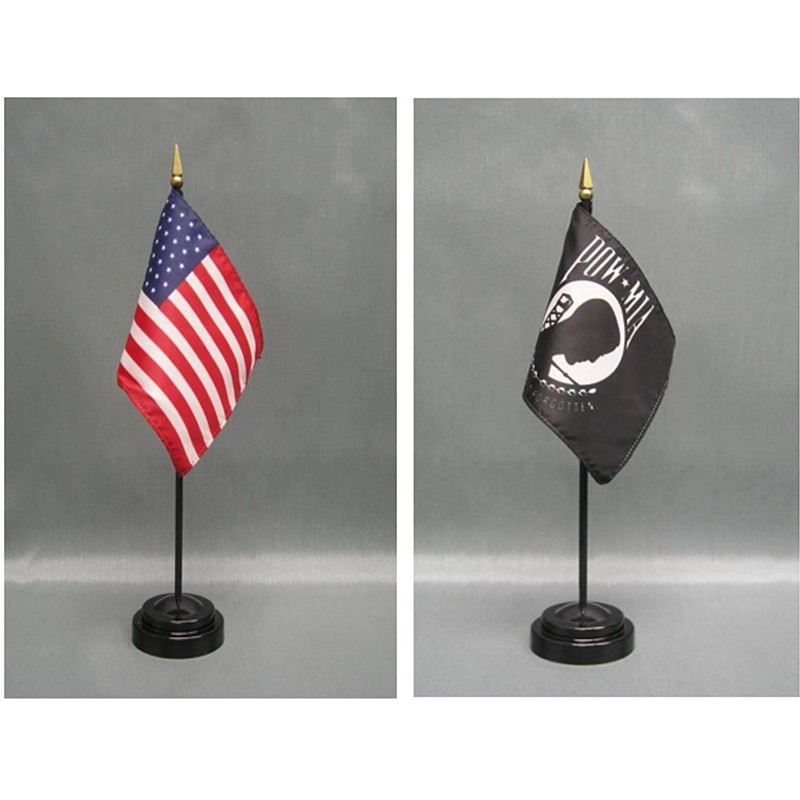 Made in The USA. 1 American and 1 Prisoner of War (POW MIA) 4"x6" Miniature Desk & Table Flag, Includes 2 Flag Stands & 2 Small Mini Stick Flags