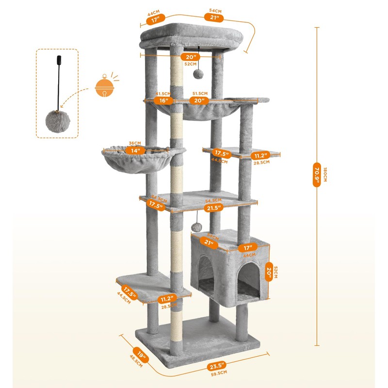 Made4Pets Tall Cat Tree, 71 Inches Cat Tree Tower for Indoor Cats Large Adult, Plush Multi-Level Cat Tower with 5 Scratching Posts, 2 Hammock, Condo and Perch, Big Cat House Indoor, Grey