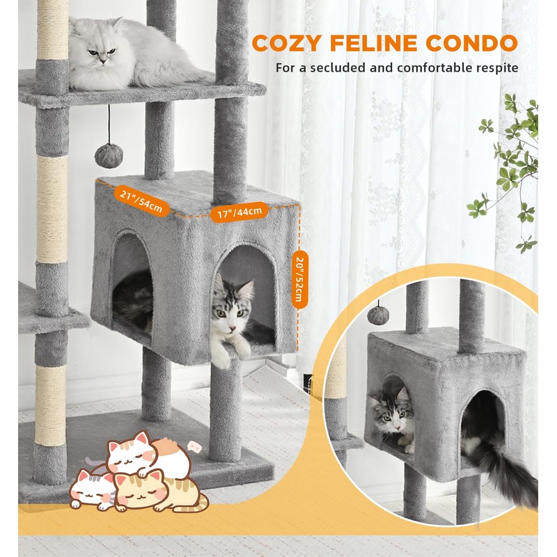 - Multi-Cat Fun & Spacious Design: Designed for multi-cat households, this large cat tree offers multiple levels, perches, and a cozy cat house for endless fun. Whether your cat loves to jump, lounge, or hide, this cat tree tower provides the perfect space to satisfy their instincts.