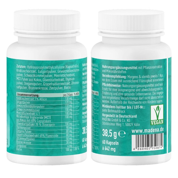 - BREITBANDKOMPLEX: CandiVital besteht aus den 15 natrlichen Inhaltsstoffen Knoblauchextrakt, Galgantpulver, Meerrettichextrakt, MCT-Pulver aus Kokos, Olivenblattextrakt, Thymianpulver, Oreganopulver, Grapefruitkernextrakt, Zitronensaftpulver, Gewrznelkenpulver, Brunnenkresse, Schwarzkmmelpulver, Zimtpulver und Biotin.