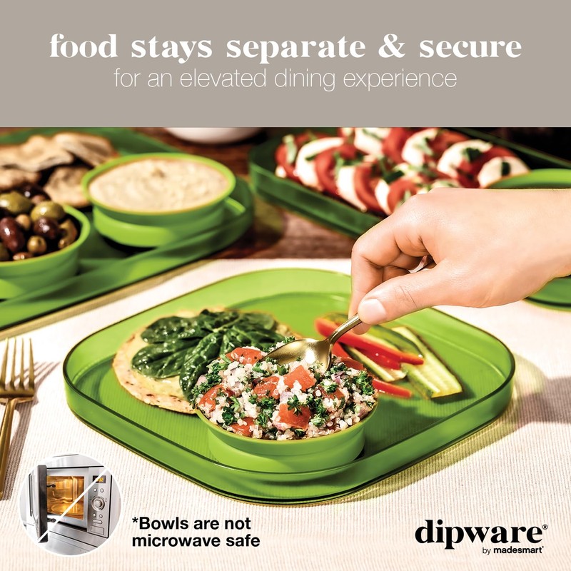 - VERSATILE DINING: Any party, any time. Dipware by madesmart keeps your food separate where it matters most, no matter what is on the menu. Whether it is burgers and baked beans, hot dogs and ketchup, chips and dip, vegetables and ranch, sandwiches and salads, or MORE, this Dinner Plate can handle it all.