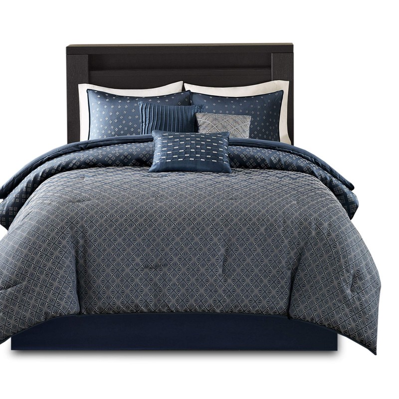 Madison Park Biloxi Jacquard Comforter Set-Modern Geometric Design All Season Down Alternative Cozy Bedding with Matching, Shams, Decorative Pillow, Queen (90 in x 90 in), Ombre Navy 7 Piece