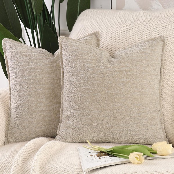 MADIZZ Pack of 2 Chenille Velvet Throw Pillow Covers 20x20 Inch Light Taupe Soft Neutral Decorative Throw Pillows Accent Boho Cushion Covers for Couch Sofa Modern Farmhouse Home Decor