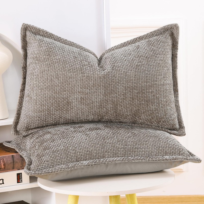 Madizz Set of 2 Chenille Velvet Cushion Covers with Flange Soft Boho Textured Throw Pillow Covers Broadside Pillowcases Modern Farmhouse Home Decor for Sofa Bedroom Taupe 12x20 inch, 30x50 cm