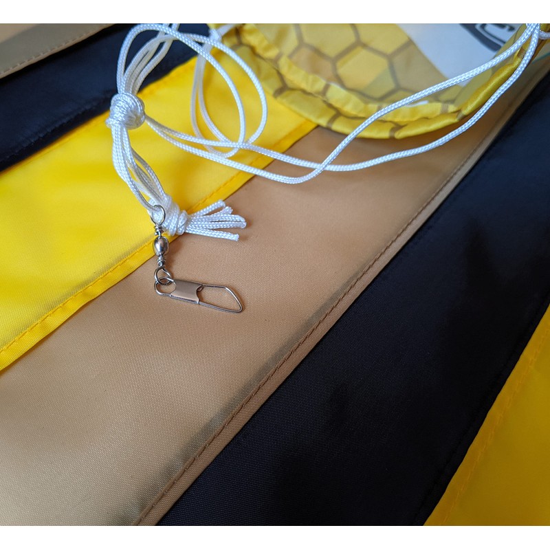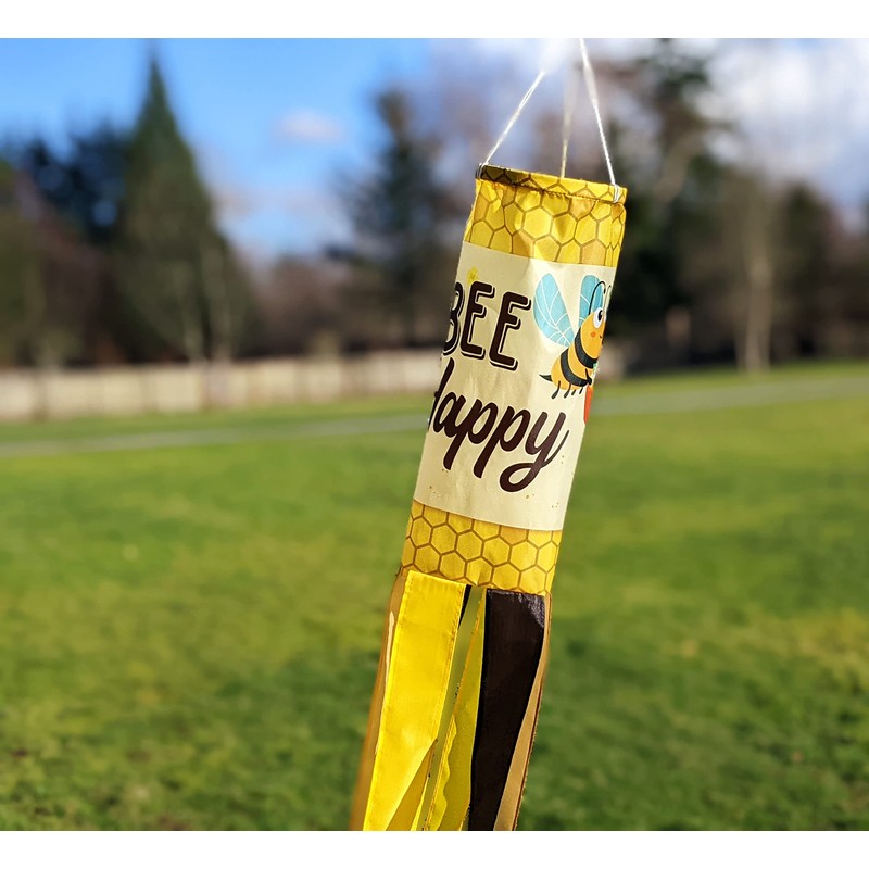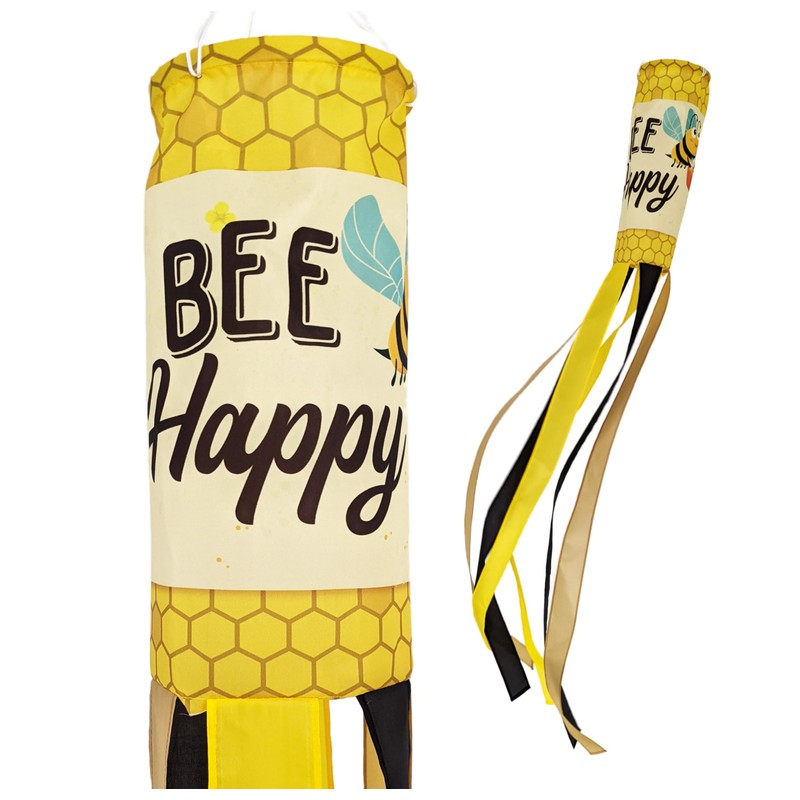 - This windsock is 60 inches long and made of high-quality polyester fabric and sewn tail edges that are weather and sun resistant for longer lasting enjoyment in the wind. The design portrays the text “Bee Happy” with a bee holding a jar of honey. It includes 6 yellow, gold and black tails to catch the breeze.