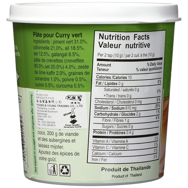 • Ingredients: Green chili, Lemongrass, Garlic, Salt, Galangal, Shrimp paste (Shrimp, Salt), Kaffir lime peel, Coriander seed, Pepper, Cumin, Turmeric.