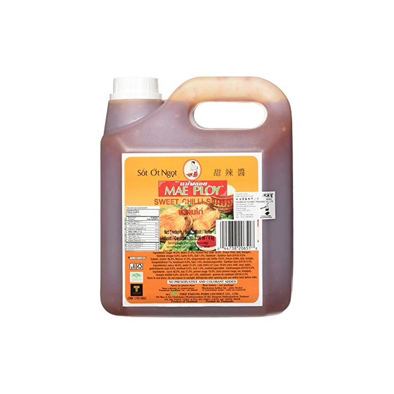 102oz Mae Ploy Thai Sweet Chilli Sauce (8.8 Pounds Total). New & sealed in factory packaging One huge container per order. Net content 102 fl oz (3000mL). Net weight 8.8Lb (4kg). About 133 servings per container. Serving size 2 tablespoon (30g). No preservatives and colorant added. Versatile dipping sauce - perfect for dipping with spring rolls, dim sum, barbecue meats (especially chicken)! Product of Thailand.