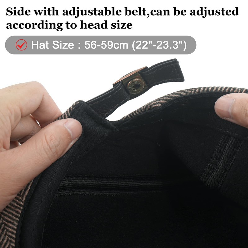- Side With Adjuatable Belt - One size fits most. The Flat Cap head circumference (Adjustable) : 56-59cm(22-23.22 inches).