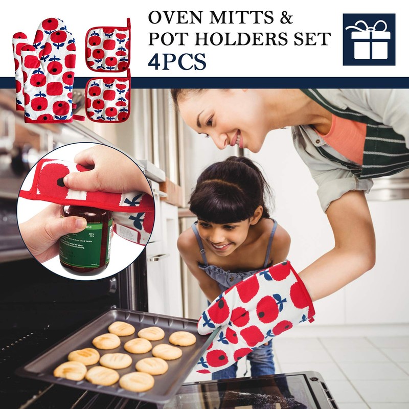 Maeau Pot Holder, Pot Holder, Mittens, Heat Resistant, Kitchen Gloves, Cotton, Oven Mitt, Burn-Prevention, Anti-Slip, Kitchen Utensils, Heat Resistant Mittens, Stylish, Unisex, Durable, Set of 4, Red 2