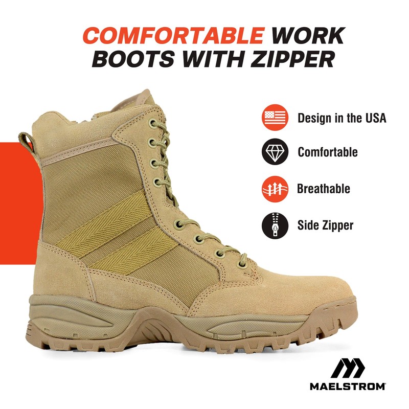 Maelstrom Tactical Combat Boots - Mens Lightweight Full Grain Leather Side Zipper Military Boots - 8" Heavy-Duty Leather Boots with Reinforced Toes