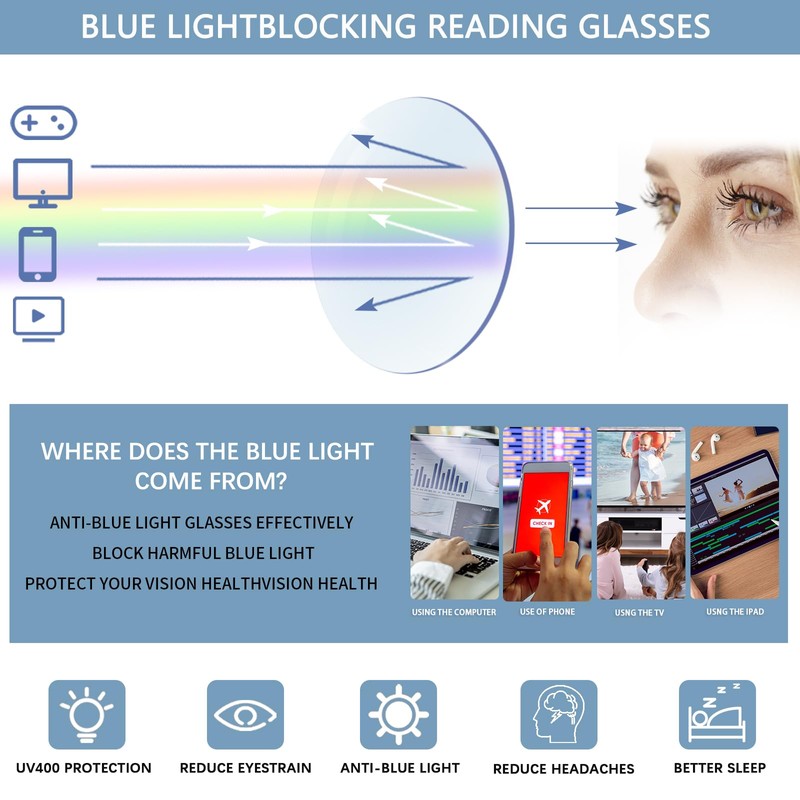 Long-term exposure to harmful blue light will cause headaches. Our blue lights blocking computer reader glasses can block computer glare, reduce headache.