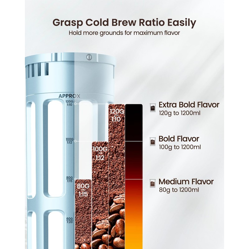 - Grasp Cold Brew Ratio Easily: Experience the art of precision brewing with our cold brew pitcher! When using 120g, 100g, 80g, and 60g of coffee grounds with the same time and water quantity, each ratio creates a distinct coffee concentration. Unlock the potential for customized cold brew strength, allowing you to savor the nuanced flavors according to your preference. Elevate your cold brew experience with our versatile pitcher.