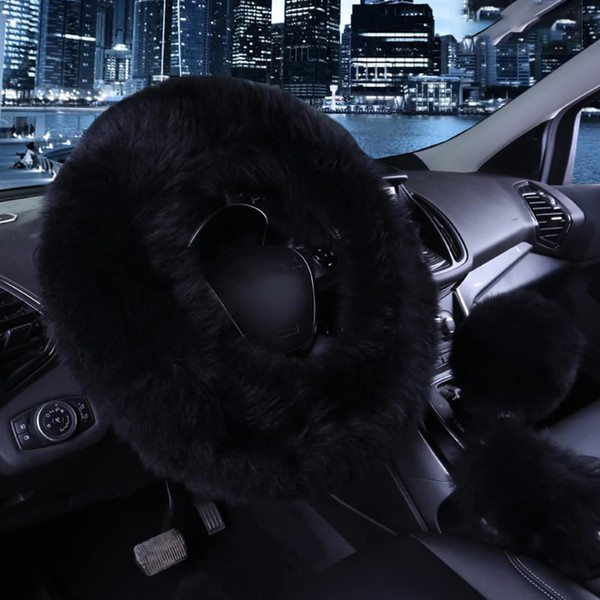 MAEZOE 3PCS Set Fluffy Wool Steering Wheel Covers with Handbrake Cover & Gear Shift Cover for Women/Girls/Ladies, 38CM (Black)