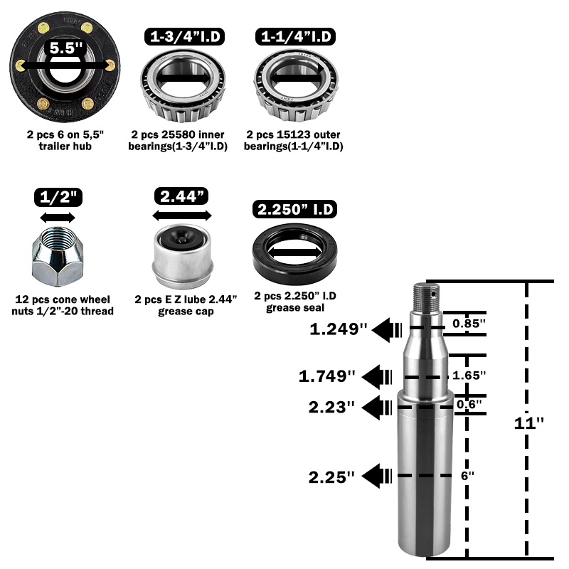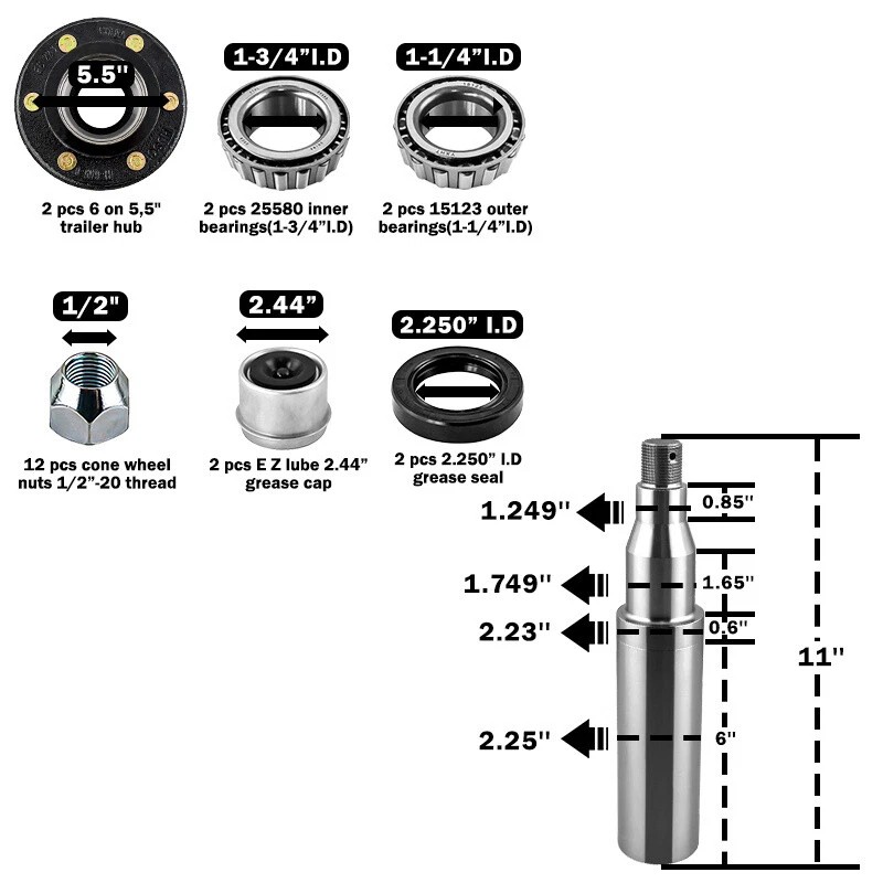 This trailer axle spindle, used on 7000# axles. It will include the axle spindle nut Wahser, Cotter Pin. The spindle is standard 1" threads, 15123 or 14125A (1.25") outer bearing, 25580 (1.75") inner bearing, and 2.25" (10-36) common grease seals. This is a spindle found on many 5200#, 6000# and 7000# axles.
