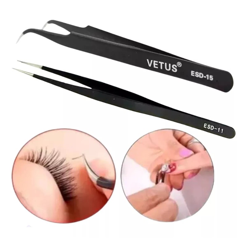 Pinzas Pestañas Postizas Acero Vetus Esd-11 Y Esd-15 Full 2pzs + Parches Aplicación de Pestañas Gratis