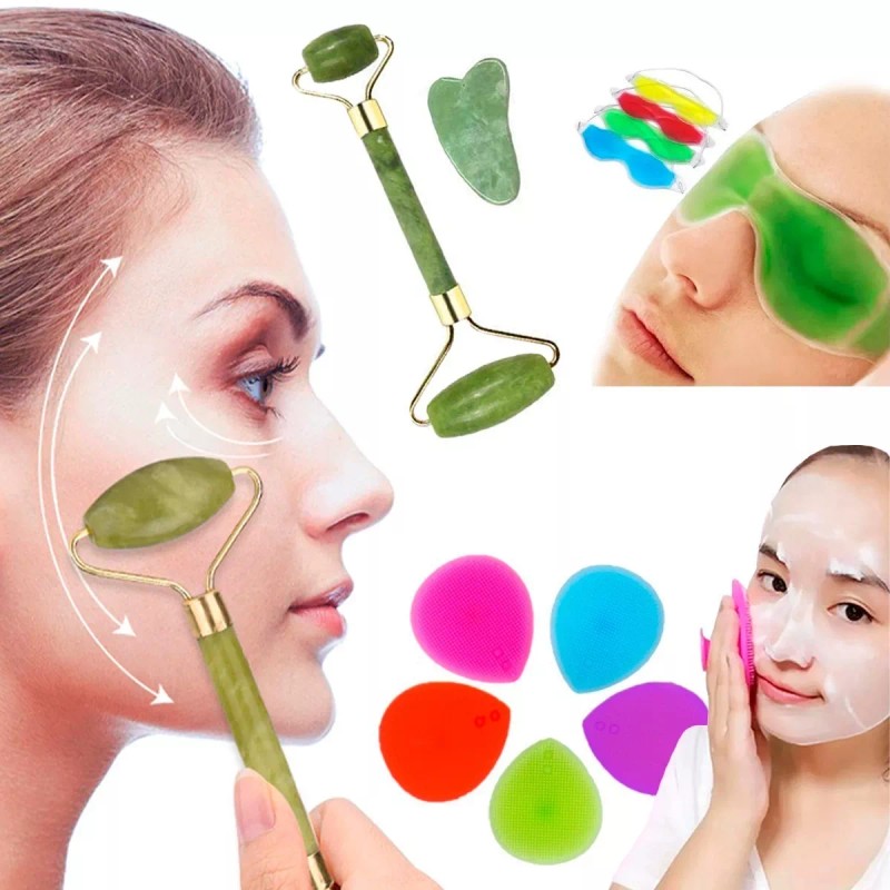 Set Rodillo Jade +guasha Masaje +cepillo Facial +antifaz Gel