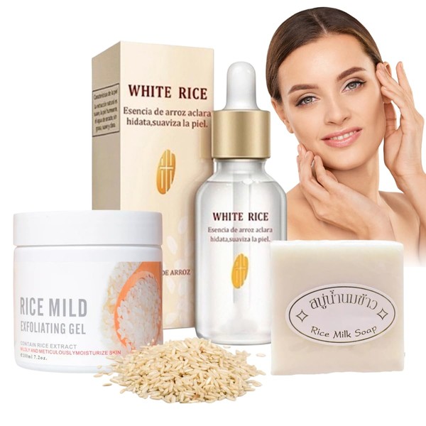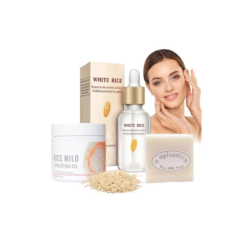 - Acerca de este artículo El Set de Cuidado Facial y Corporal, inspirado en el arroz, proporciona una experiencia completa de cuidado de la piel que se centra en la aclaración y mejora de la apariencia de la piel. Este set incluye tres productos esenciales: un exfoliante corporal, un serum facial y un jabón para cara y cuerpo, todos formulados con los beneficios naturales del arroz. Aquí tienes una descripción detallada: Exfoliante Corporal de Arroz: