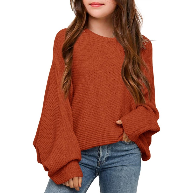 Mafulus Girl's Oversized Crewneck Fall Sweaters Kids Batwing Long Sleeve Slouchy Chunky Cute Pullover Jumper Shirts 5-14T Orange