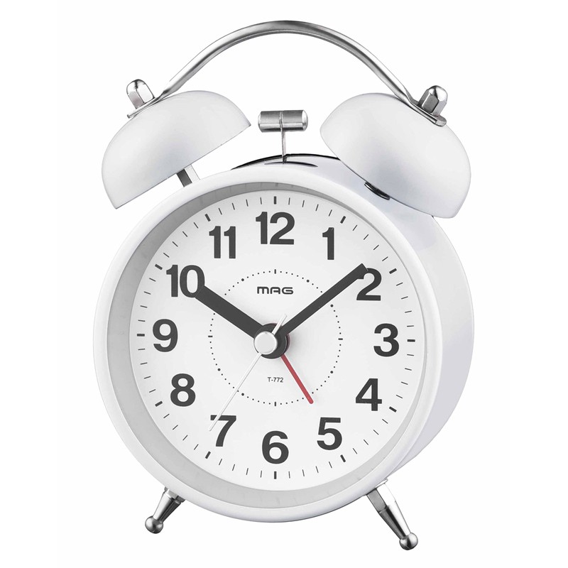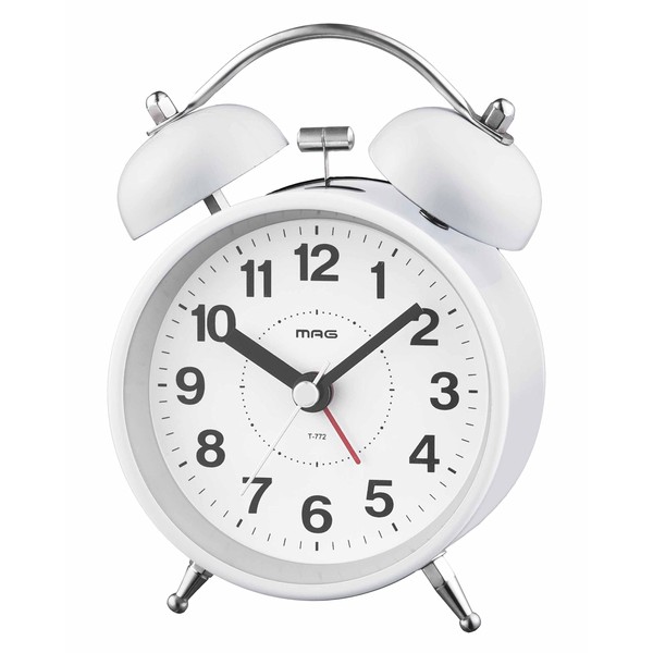 MAG T-772WH-Z Alarm Clock, Loud Volume, White, Analog, Twin Bell, Quiet, Continuous Second Hand, Snooze Function, Light Included