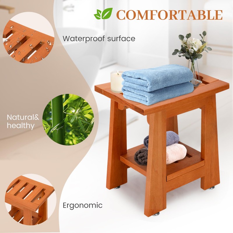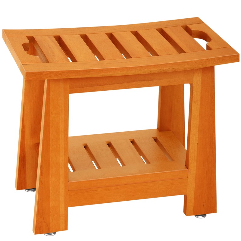 - Stable Structure, 350 lbs Load-Bearing – The open shelf design at the bottom not only provides convenient storage for items like towels but also enhances the Teak Shower Bench Seat overall stability. The teak Shower Stool can support up to 350 lbs, allowing for peace of mind during use