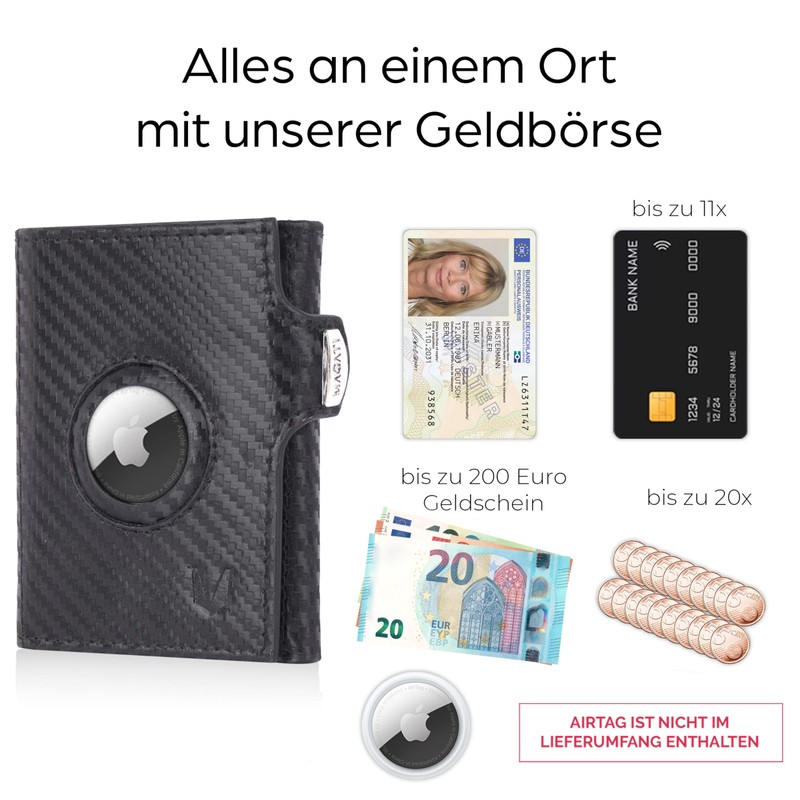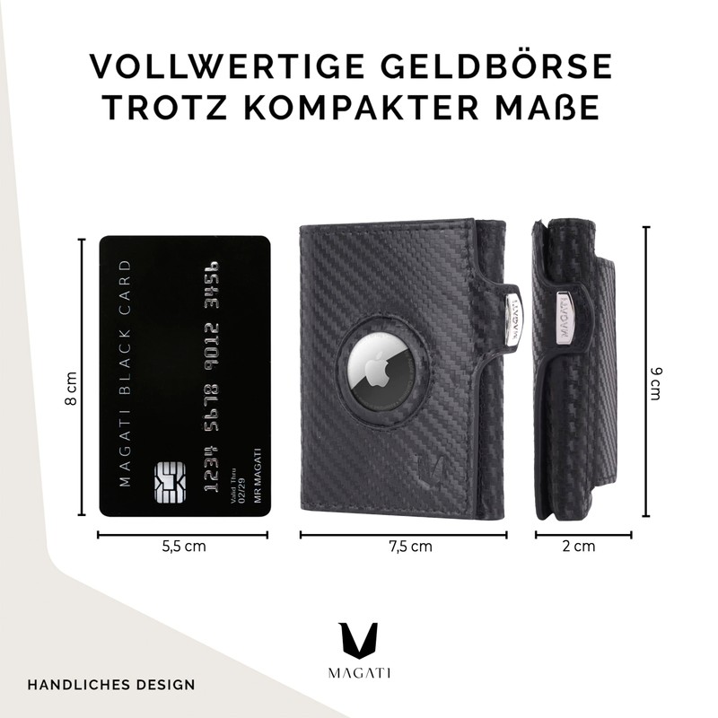 - Safety: Secure wallet for the whole world! Our RFID slim wallet uses NFC/RFID blocker for maximum protection - no additional protection card required. Compatible AirTag tracker case: safety and practicality in one. Our wallet seamlessly integrates the Apple AirTag Tracker with a form-fitting slip pocket on the front. Your valuables are protected and easy to find - the ideal companion for everyday use