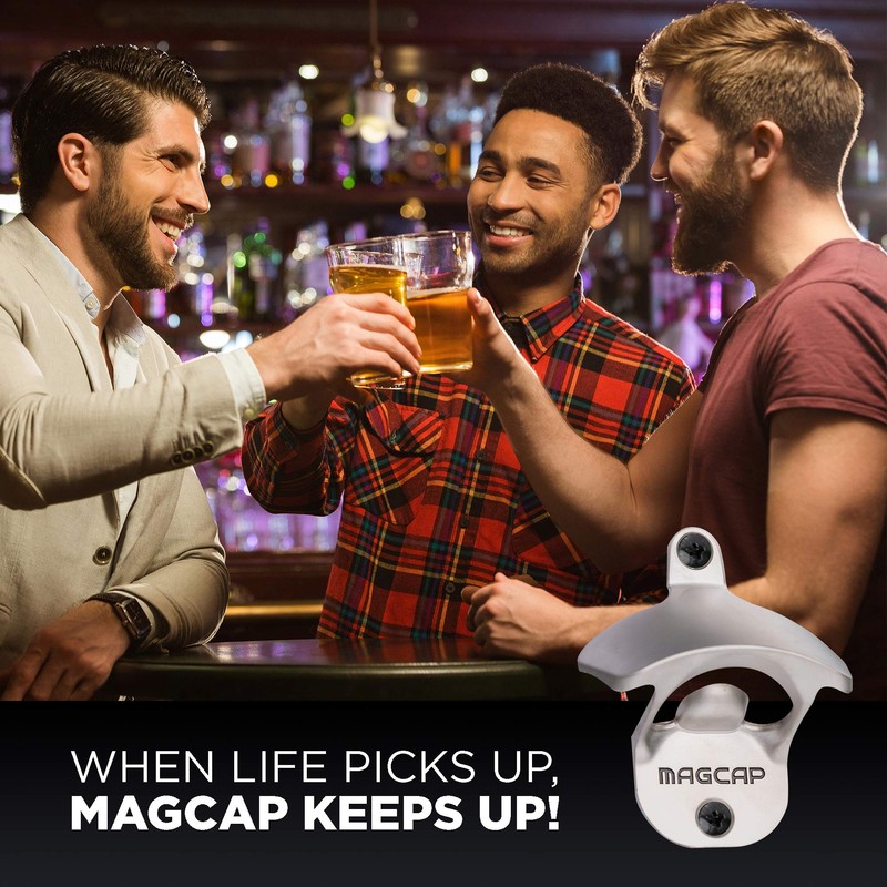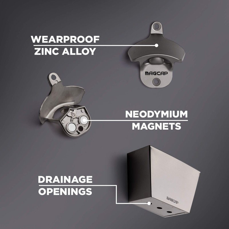 - A TOUCH OF INOVATION - the MAGCAP Bottle Opener has neodymium magnets secretly placed where they don't hurt the aesthetic of the bar-style accessory. They catch caps as they fall, so they never stray away from your Bottle Cap Catcher. Open your bottle and forget the cap!