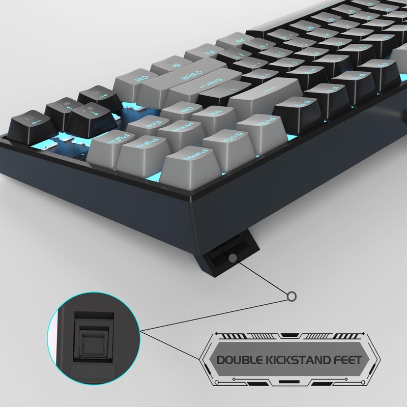- [Ergonomic mechanical keyboards]: stylish black grey mash up 75% layout, come with extra 16 red keycaps, double-shot injection non-slip suspension keycap, splash-proof design, durable metal panel enough to protect it from scratch, also firm kickstand feet adjustable typing angle.